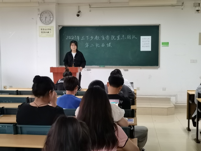 为进一步强化实践育人专业性、针对性和实效性,教育学院于5月14日,在3栋301教室举行了2023年暑期“三下乡”教育学院重点团队第二轮面试。本次活动由教育学院团委学生会组织部主办,团委学生兼职副书记程雨彤、四兆琦,组织部部长李艾锦作为面试官出席活动。