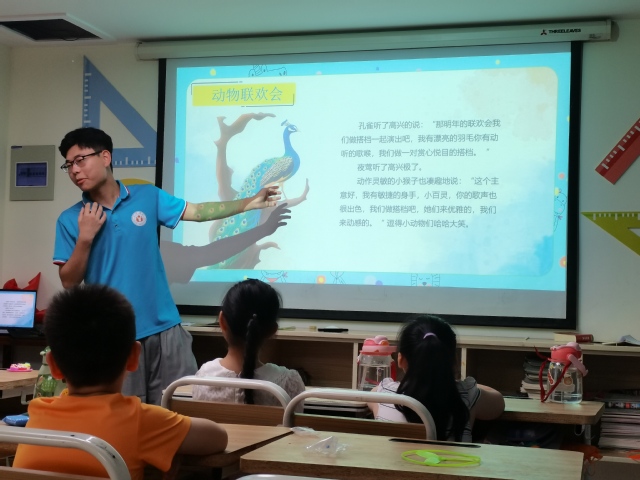 学会赞美别人,是一种能力、一种气度;学会欣赏自己,是一种理解、一种智慧。赞美是生活中的宝贵品质,就像是盛开的花朵,当你将其赠与他人时,自己也会收获一份芬芳。7月7日下午,合肥学院教育学院“七彩童年,‘育’你相伴”三下乡团队来到滨湖和园社区开展社会实践活动,团队成员田鑫和李硕硕以“朋友,你真棒”为主题开展了一堂团体心理辅导课。 课堂伊始,田老师使用手语操引入课程,借此引发学生对手语歌的歌词与动作的思考。当歌曲《你真的很不错》响起,同学们就模仿老师的动作开始做起手语操。在欢快激昂的音乐声中,大家对彼此竖起大拇指,大声说道“你是真的、真的、真的很不错!”歌声将歇,同学们还久久沉浸在愉悦的氛围中。随后,田老师给同学们讲了一个充满童趣的故事——《动物联欢会》,故事中,孔雀与夜莺相互欣赏、彼此赞美。歌曲与故事互相映证,让同学们更深入地理解“每个人都有自己的特色,人们在相处交往时就像在照镜子,你欣赏别人,别人也就会欣赏你”这一课程主题。