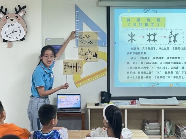 7月9日,为弘扬中国传统书法艺术,合肥学院教育学院“七彩童年,‘育’你相伴”三下乡团队来到滨湖和园社区开展社会实践活动,志愿者尹冰清为孩子们带来“书画最美汉字”这一艺术课程。 悠悠中国墨迹,淌淌中华文化。自仓颉造字,到天下第一行书的王羲之,汉字完成了象形至楷书的升华,蕴含着的是中华五千年流淌的血液。课堂上,志愿者尹冰清通过讲述汉字的起源和故事,引领孩子们走进了神奇的书法世界,初步了解汉字的造字智慧和独特文化。志愿者按时间线展示着一幅幅书法作品,孩子们跟着老师的讲解重回远古,从神话传说《仓颉造字》开始,一路探寻汉字的历程。志愿者尹冰清从书法的变迁讲到书写的要求:要多练、定时、定量、定体,并给孩子们示范了书写的姿势,之后又深入浅出的讲解书法基础知识,从基本的起笔、行笔、收笔要领到字的形态结构,无一不细致。志愿者不仅教导学生写好字的理论知识,还给孩子们讲授汉字的来历、书法家的故事……孩子们都兴趣盎然,显然,这堂课已经让他们对身边随处可见的汉字拥有了全新的认识。