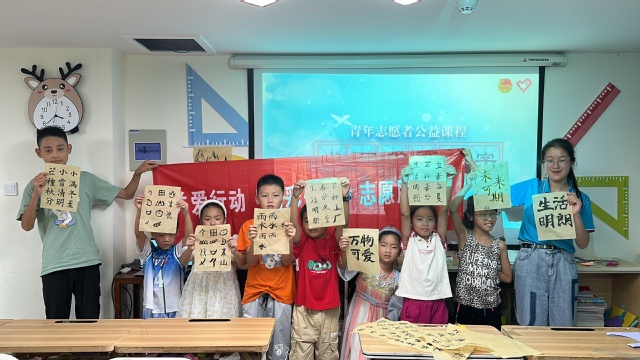 一笔一画皆是修炼,一点一滴皆是成长,书法学习离不开练习。志愿者尹冰清细致地教导孩子们学习书法,了解笔墨纸砚,学习握笔和运笔。在此之后,志愿者组织孩子们用毛笔和墨水在自色宣纸上进行书法体验,完成自己的第一份书法作品,鼓励他们将理论化为实践,亲身体会汉字书画同源的妙趣。在此过程中,志愿者特地根据学生自身特点,把符合孩子们年龄段的生字写成字帖,让孩子临摹。志愿者向孩子们充分展示各个字的书写过程,讲清每一个字的关键性的笔画和要求,做到“字”、“法”并见。孩子们专心致志,认真聆听观察志愿者的讲解与示范,在科学的学习方法中不断提高、进步。在现场临写活动中,孩子们跟着者愿者改进自己的握笔技巧,一整堂课都在不断尝试中愉快度过。