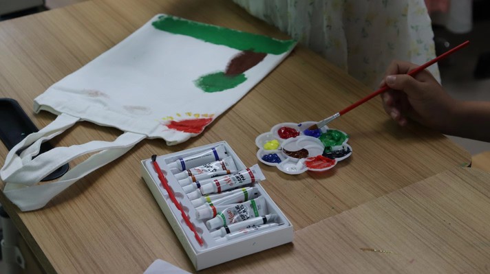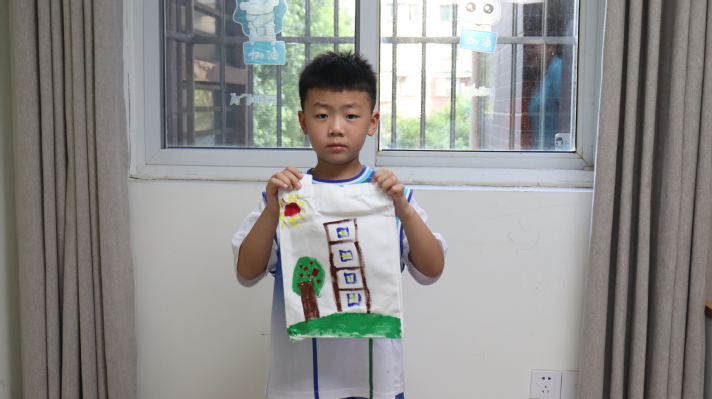 无论是“篱落疏疏一径深,树头新绿未成阴”的小小村落,还是华灯初上、车水马龙的繁华都市;无论是山环水绕的红砖青瓦,还是拔地而起的玉树琼楼,只要是家乡总是令人如痴如醉,魂牵梦萦。为丰富社区青少年的假期文化生活,帮助他们更加了解家乡的环境,感受家乡的变化,7月8日,合肥学院教育学院“七彩童年,‘育’你相伴”志愿团队来到滨湖和园社区,志愿者王欣悦和尹冰清为孩子们带来了“绘出我的美丽家乡”公益美术课堂,让孩子们用五彩的颜料在帆布包上绘出心中的家乡。 家乡的模样是爱意在脑海中一笔一墨的勾勒,是回忆在脑海中一点一滴的汇聚。志愿者王欣悦告诉孩子们,家乡是难忘的风景,是念念不忘的美食,是独特的舞蹈与服饰,也是在劳动人民的汗水下铸造的精美绝伦的建筑。随着志愿者话音落下,孩子们稚气的眼睛充溢星光,好像盛满了家乡的模样,紧接着孩子们便兴高采烈地分享自己的故乡。