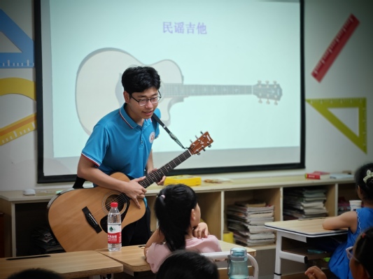 有这样一种乐器,不管是在茶余饭后的家庭音乐会,还是在学校操场的草坪上,人们都能随时随地和它一起弹唱,这种乐器就是吉他。吉他的和弦是夏日的浪漫,迎着午后炙热的阳光,志愿者将孩子们迎进教室。上课前,志愿者的手指轻弹琴弦,为孩子们弹奏了本节课要学习的歌曲——《小星星》,跳动的音符如精灵一般,在空中翩翩起舞。孩子们都听得如痴如醉,迫不及待地想要了解有关吉他的知识。课程开始后,志愿者先简单介绍了吉他,并教孩子们如何去区分三种不同类型的吉他。紧接着,志愿者通过图片展示的方式,带领孩子们了解吉他的结构、功能及其演奏姿势。为了让孩子们更直观地感受到音乐的魅力,志愿者让孩子们自己动手弹奏吉他,并在一旁耐心地给孩子们传授弹奏的技巧,细心地纠正他们的错误。在志愿者的指导下,许多孩子都可以简单地弹奏一些音符。在课程的最后,两位志愿者和孩子们一起随着吉他的伴奏,合唱了三首耳熟能详的儿歌:《小星星》、《粉刷匠》、《两只老虎》。“一闪一闪亮晶晶,满天都是小星星。”在教室里,孩子们稚嫩的歌声和志愿者的领唱声交织,一同谱写出属于这个夏天的悠扬乐章。志愿者们用音乐走进孩子们的内心,让他们在音乐中享受童年的快乐。