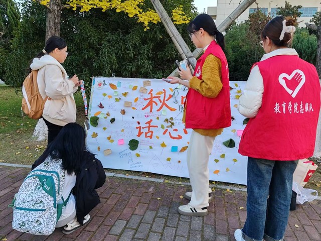 为了增强同学们的心理健康意识,帮助大家更好地应对生活中的困难和挑战,11月20日至21日,教育学院阳光心理志愿服务队在一期东门处举办了“落叶寄心语”活动。