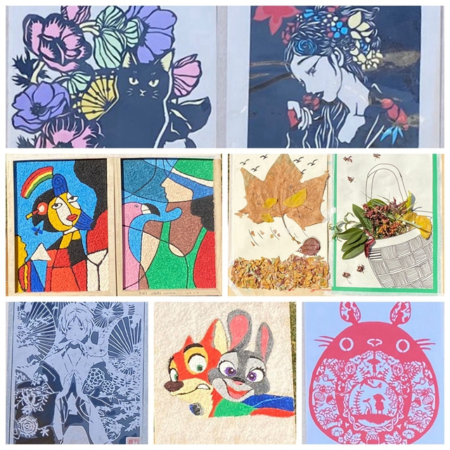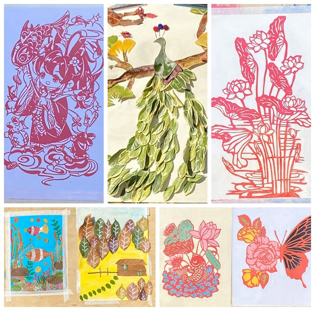 本次展览作品由21级学前教育普本班学生完成,涉及剪纸刻纸、树叶粘贴画、纸浆画等多种艺术表现形式,作品色彩鲜明、奇思妙想、稚趣盎然,体现了学生们对艺术的热爱,凸显了学前专业特色。展出期间,前来观看的学生也络绎不绝,他们在各式各样的作品前或驻足欣赏,或细心品味,不时用手中的相机或手机拍摄,留下精彩画面。