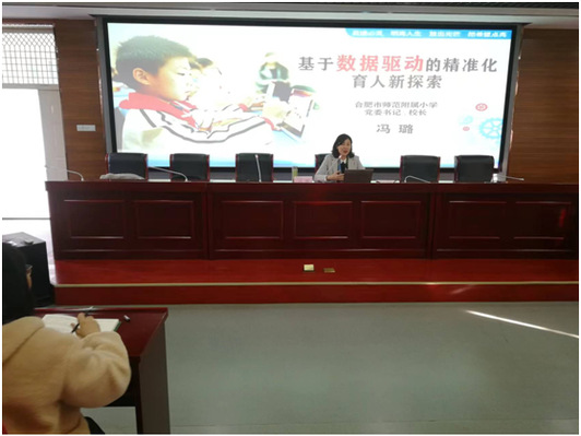 冯璐校长主要向师生们介绍了合肥师范附小聚焦五育并举视域下的学校评价改革、利用数字技术助力学校的课堂评价、学生综合素质个性化评价等方面做出的精准化育人新探索。重点探讨了为什么需要数据驱动“精准化育人”、 数据技术如何赋能日常学习、如何绘制个性化图谱驱动精准育人等三个方面问题。报告会得到了与会人员的高度赞同和认可。