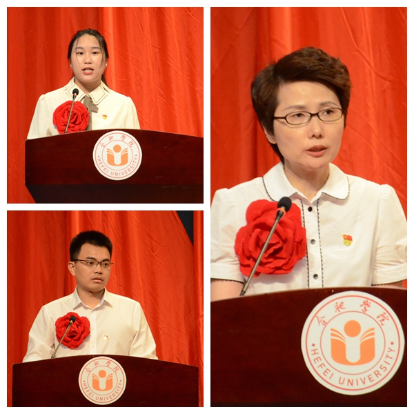 优秀共产党员代表、语言文化与传媒学院学生党员赵琼琼同学,优秀党务工作者代表、人工智能与大数据学院教工第三党支部书记王磊,先进党组织代表、生物食品与环境工程学院党委书记纪平先后发言。他们结合各自的学习工作实际,用朴实的话语、生动的事例,表达了对党的赤诚之情和为学校事业发展贡献力量的决心。