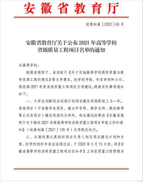 近日,安徽省教育厅公布了2021年度高等学校省级质量工程项目立项名单,我校8项教学成果喜获省级教学成果奖,其中《“专业、就业、产业”三业一体,打造双元制高等教育人才培养“合肥模式”》、《通专融合、理实融合、文理融合,人才个性化培养——模块池课程体系的探索实践》和《聚焦“四创融合”,推动“三体系”育人,创新创业全生态教育体系构建与实践》3项成果荣获省级教学成果奖特等奖,在全省高校中名列前茅。