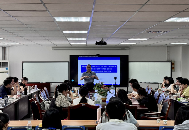 2025年6月24日上午,“分段光滑系统理论及其应用天元数学讲习班”系列课程邀请华南理工大学二级教授、博士生导师杨启贵教授37号楼305教室为天元班学员作短课程报告,报告主题为“非光滑系统同宿轨、奇异环与混沌复杂性”。本次报告由学院党委书记牛欣教授主持。