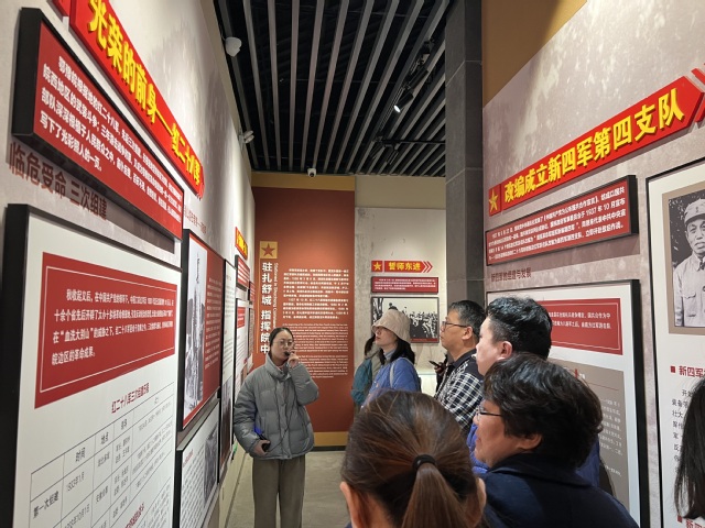 新四军第四支队司令旧址共有三个部分,包括200多米长的进馆栈道、红军广场及司令部旧址。其中司令部旧址分前厅和后厅两大部分,前厅主要介绍了新四军四支队的发展历史,配有叶挺、高敬亭等六位将军的浮雕,以及四支队战士们使用的武器、战地沙盘等展示,后厅介绍了当时主要的战役战斗,并以声光电、情景再现等形式进行了展示。在讲解员的带领下,全体党员怀着无比崇敬的心情参观了新四军第四支队司令部旧址。一幅幅珍贵的历史照片、一件件饱经沧桑的革命文物、一段段感人至深的英雄故事,生动再现了新四军将士们英勇抗战的光辉历史,让大家深刻感受到革命先辈们坚定的理想信念、顽强的斗争精神和崇高的爱国情怀。