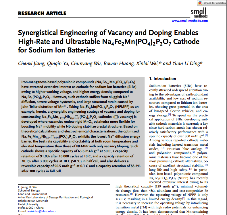 2025年5月,日韩欧美福利视频_黑人巨大人精品欧美三区_欧美成人另类人妖_欧美在线精品一区二区三区_欧美一区二区三区性视频_日韩精品欧美视频_性欧美极品xxxx欧美一区二区生物食品与环境学院22级资源与环境专业研究生蒋晨熙以第一作者身份在国际学术期刊《SmallMethods》(IF=10.7,中科院二区)发表了题为“SynergisticalEngineering of Vacancy and Doping Enables High-Rate and UltrastableNa4Fe2Mn(PO4)2P2O7Cathode for Sodium IonBatteries”的研究论文。我校高级实验师卫新来、湖南大学教授丁元力为通讯作者,日韩欧美福利视频_黑人巨大人精品欧美三区_欧美成人另类人妖_欧美在线精品一区二区三区_欧美一区二区三区性视频_日韩精品欧美视频_性欧美极品xxxx欧美一区二区为第一完成单位。