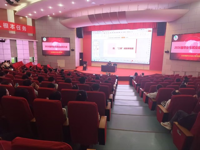为助力2026届毕业生把握毕业要求、明确就业方向,10月17日下午2:30,生命健康与环境工程学院在图书馆A报告厅举办2026届毕业生就业动员大会。生环学院党委书记杨红、党委副书记姚蓓蓓、副院长笪春年、校党委人民武装部国防动员科科长郑国平、全体毕业班辅导员以及2026届本科生和研究生参与本次会议,会议由姚蓓蓓主持。本次大会围绕“毕业准备、就业指引”两大核心,为大家送上“毕业就业指南”,希望能为大家的未来规划提供切实帮助。