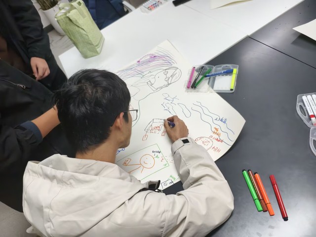 活动现场,同学们分组围坐,在画纸上接力创作涂鸦接龙。每位参与者用画笔描绘心情故事,再传递给下一位同学继续创作。这种独特的互动形式,让智慧教室变成了创意的工坊,同学们在轻松愉悦的氛围中,用色彩对话,以图形交流。涂鸦作为一种非语言的表达方式,能够帮助同学们释放心理压力,培养艺术感知能力。在轻松愉快的创作氛围中,同学们暂时忘却学业压力,全身心投入到艺术创作中,用色彩诉说内心情感。