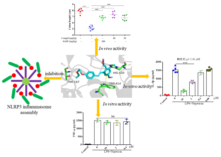 据统计,目前全球有700万炎症性肠病患者,且发病率还在持续上升,且临床上缺乏安全有效的治疗药物。为了开发治疗炎症性肠病药物,该团队基于“食药同源”的理念,多年来一直围绕天然产物紫檀芪开展结构优化和药用性质研究工作。目前成功设计合成出一种新型、高效的核苷酸结合寡聚化域样受体家族3NLRP3)抑制剂,该抑制剂具有良好的抗炎活性和成药性,在动物实验中表现出较好的生物学活性,具有进一步开发的潜力和价值,为天然产物紫檀芪药用性质开发提供了参考。该研究得到了安徽省自然科学基金、安徽省高校自然科学研究项目、安徽省重点研发计划项目以及合肥学院人才项目的资助和支持。