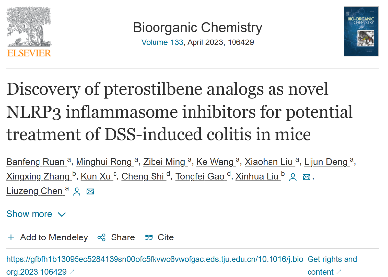 近日,我院阮班锋研究员团队在国际知名刊物《BioorganicChemistry》(中科院化学一区,Top期刊)上以“Discoveryof pterostilbene analogs as novel NLRP3 inflammasome inhibitors forpotential treatment of DSS-induced colitis inmice”为题发表了天然产物紫檀芪的药用性质开发方面的最新研究成果。阮班锋研究员为论文第一作者,合肥学院为该论文第一署名单位。