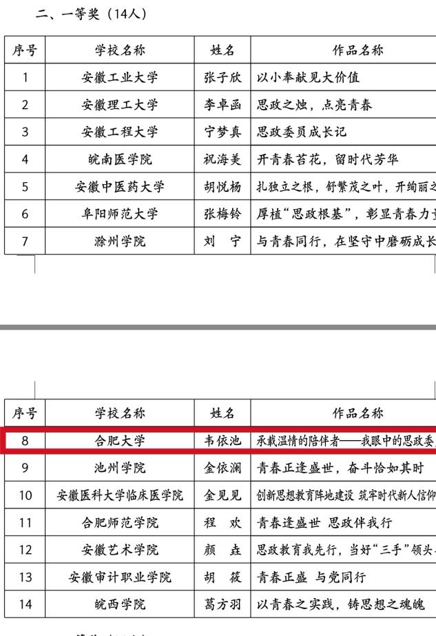 在安徽省高校班级思政委员征文比赛中,生物食品与环境学院22食品科学与工程一班韦依池同学荣获一等奖。