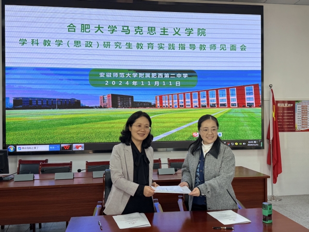 为提升我院研究生的专业水平和实践能力,加强课堂理论知识与具体实践的结合,根据专业学位硕士研究生人才培养方案要求和教学计划安排,11月11日上午,我院苏冰副院长带领5名2024级学科教学(思政)研究生赴安徽师范大学附属肥西第二中学开展为期两周的教育见习活动。