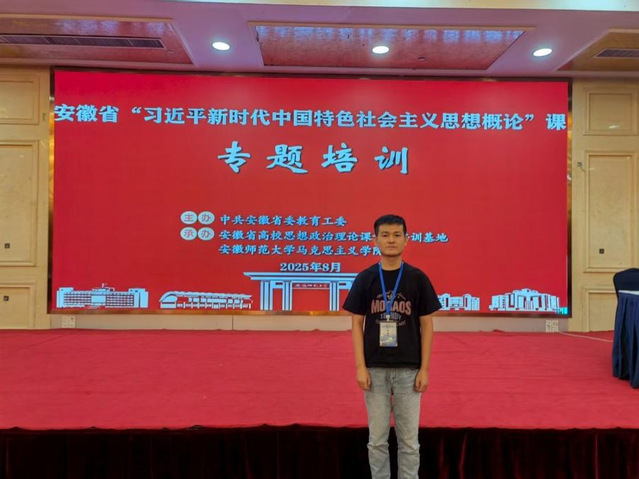 8月20日至24日,安徽省2025年“习近平新时代中国特色社会主义思想概论”课专题培训班在芜湖举办。本次培训由中共安徽省委教育工委主办,安徽省高校思想政治理论课教师培训基地、安徽师范大学马克思主义学院承办,我院陶德强老师参加了此次学习。