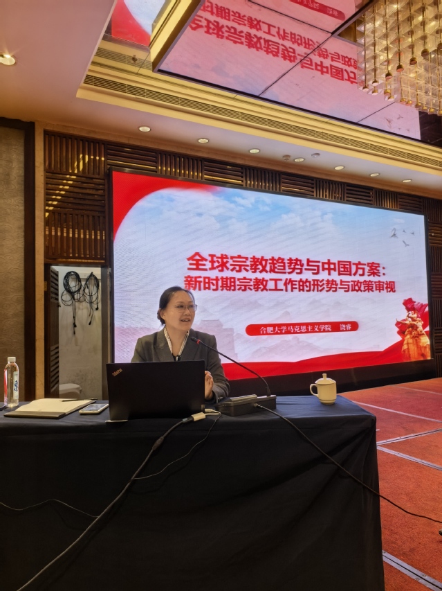 2025年11月14日上午,由中共合肥市委统战部主办的合肥市宗教界代表人士培训班在泓瑞金陵大酒店顺利举行。我院饶睿老师以《全球宗教趋势与中国方案:新时期宗教工作的形势与政策审视》为题,为全市150余名宗教界代表人士带来了一场兼具理论深度与实践价值的精彩分享。