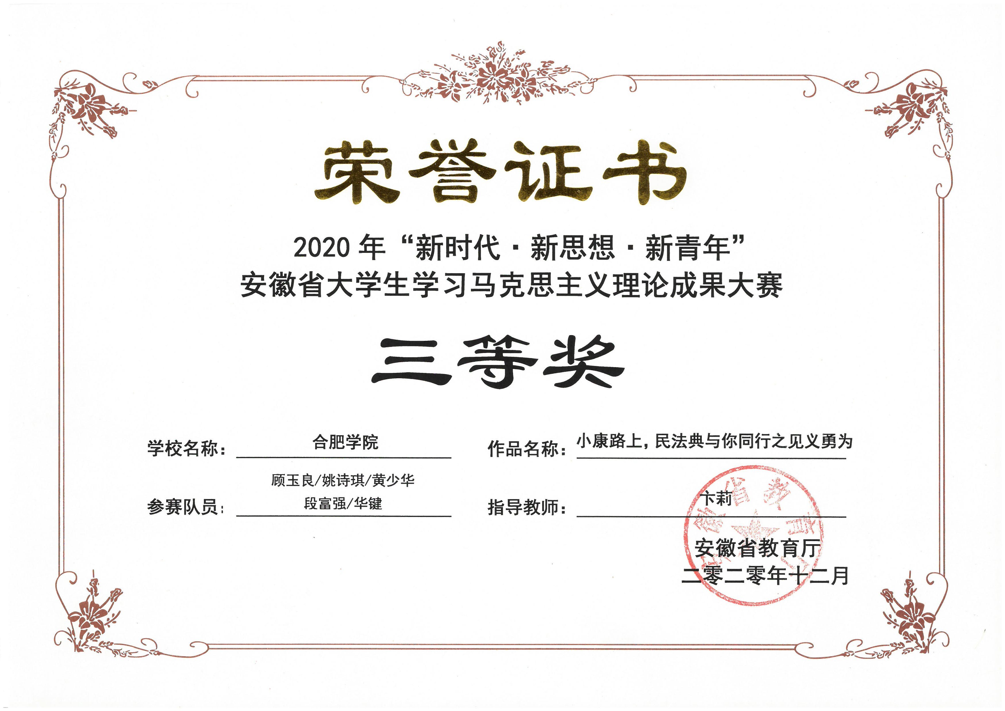 2020合肥学院-顾玉良、姚诗琪、黄少华、段富强、华键-微创作《小康路上,民法典与你同行之见义勇为》省级三等奖