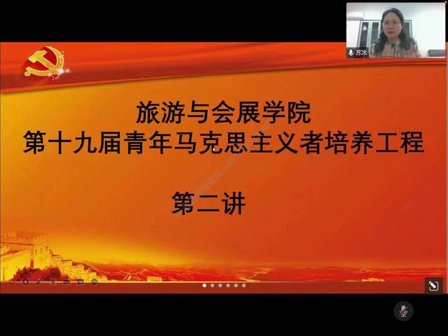 11月16日,旅游与会展学院第十九届青年马克思主义者培养工程第二讲在线上顺利召开,旅游与会展学院团委邀请我校马克思主义学院苏冰教授为第十九届青年马克思主义者培养工程全体学员上课。