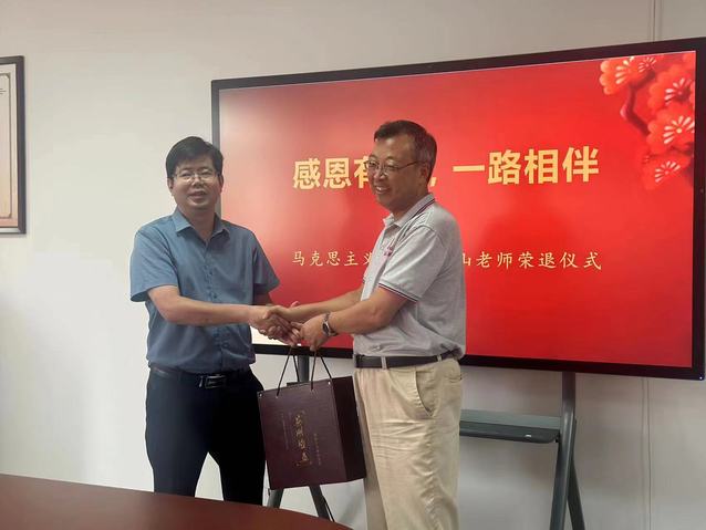 为增强退休教师的成就感、幸福感和荣誉感,充分体现对退休教师的关怀,进一步激发全院教师爱岗敬业、恪尽职守的热情,8月30日下午,马克思主义学院全体教师齐聚一堂,在会议室举行姜从山老师的荣休仪式。马克思主义学院院长陈志超、马克思主义学院副院长苏冰及学院全体教师参加,仪式由副院长苏冰主持。