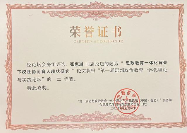 我院教师在大中小学思想政治教育一体化论坛上获奖 1月6日,第一届“大中小学思想政治教育一体化”理论与实践论坛在合肥举行。我院教师张惠琳博士受邀参会,所提交论文荣获二等奖。