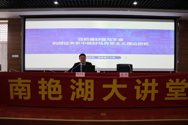我院举办“做好马克思主义理论研究”南艳湖大讲堂学术报告 3月15日下午,由科研处、马克思主义学院共同主办的南艳湖大讲堂学术报告在一期6号楼报告厅举行。特邀华东理工大学马克思主义学院副院长邱卫东教授作题为“在把握好变与不变的辩证关系中做好马克思主义理论研究”的学术讲座。讲座由马克思主义学院直属党支部书记、副院长苏冰教授主持。全体思政课教师与部分学生共100余人参与此次报告会。