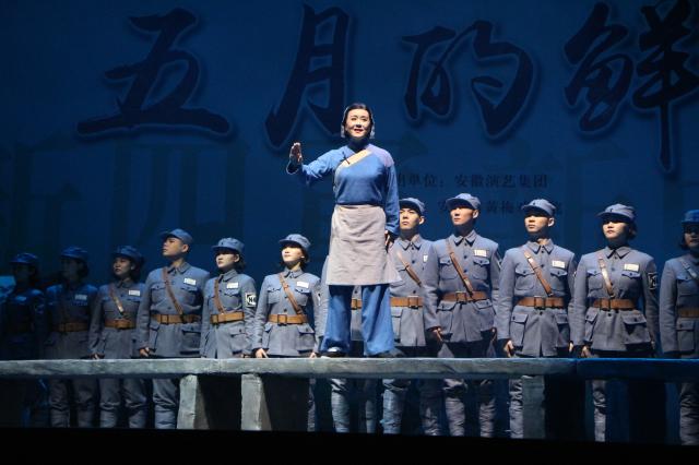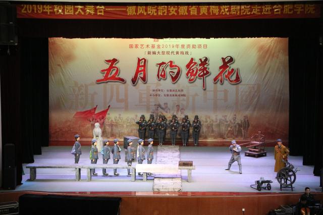 一声锣响,由安徽演艺集团创排出品的新编大型现代黄梅戏《五月的鲜花》拉开了表演的帷幕。运用传统乐器与交响乐相结合的形式,汇聚众多国家级演员,采用精细讲究的舞台布置,才造就了《五月的鲜花》这一精品戏曲。全剧通过“约法三章”、“银圆风波”、“生死欠条”、“黎明托孤”、“江边话别”、“书院涅槃”等真实感人的戏剧场面,以顾重光、童华等一组新四军群像的塑造,让人们感受到那一代人身上的情感硬度和信仰纯度,昭示着中国共产党夺取全国胜利、走向辉煌的历史必然,兑换小分队谱写了一曲共产党人诚信如天的生命壮歌。《五月的鲜花》把握了时代审美特征,体贴人民群众的审美选择,绚丽的舞美、创新的形式紧紧吸引住在场师生们的注意,现场掌声如潮。