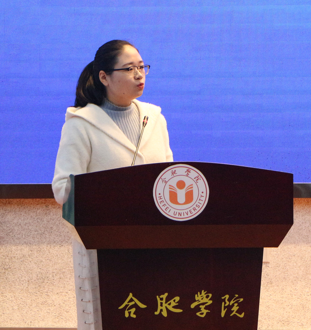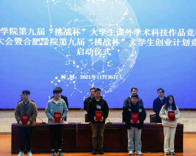 高大明宣读了合肥学院第九届“挑战杯”大学生课外学术科技作品竞赛表彰文件。与会领导为优秀组织奖获奖单位、优秀指导老师代表、优秀团队代表颁发了奖牌和证书。优秀指导老师刘婧和学生代表周子健发言,他们分别以“同心协力、不怕困难、精益求精”和“好的选题是成功的一半”为关键词,分享了参加“挑战杯”比赛的所想、所感和所获。