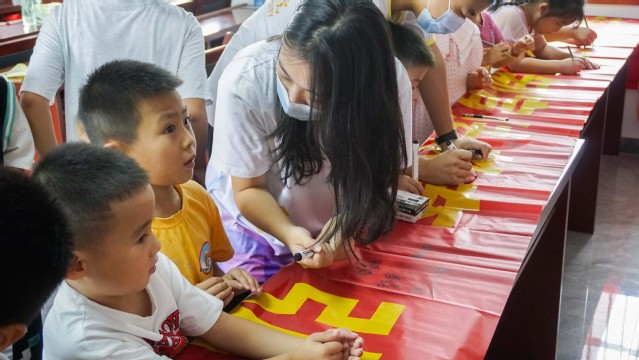 一条红领巾,连接当下与过往;一堂“思政课”,激荡信心与力量。8月17日,实践团队开展了主题为“红领巾,心向党”的少先队实践营专项活动。志愿者们为江夏店社区综合文化服务中心的小朋友们举行了庄严的少先队入队仪式,唱队歌、佩戴红领巾、宣誓,整个活动仪式规范有序,引导队员们继承少先队的光荣传统,增强了少先队员们的光荣感和自豪感。