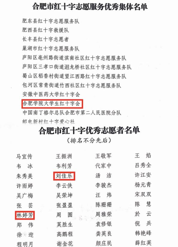 为树立典型,进一步践行“人道、博爱、奉献”的红十字精神,合肥市红十字会通报表彰了2022年度合肥市红十字志愿服务优秀集体优秀志愿者,我校大学生红十字会荣获“合肥市红十字志愿服务优秀集体”称号,我校林婷芳和刘佳乐两位同学荣获“合肥市红十字优秀志愿者”称号。