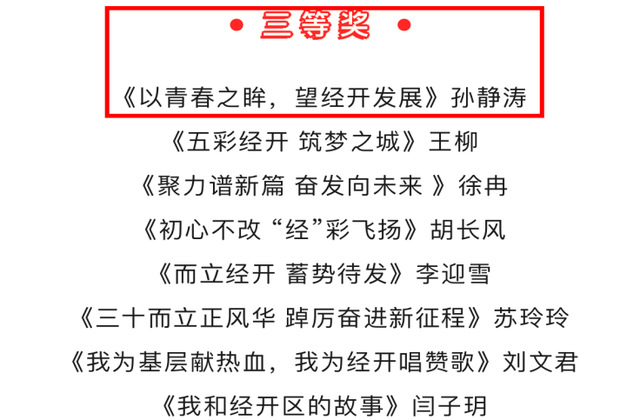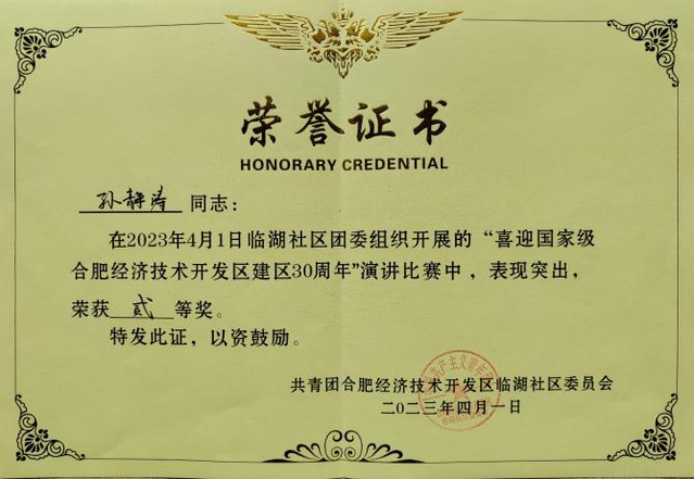 为充分展示经开区新时代青少年的良好精神面貌,进一步激发青春力量立足新起点、开启新征程,合肥经开区党政办、团工委联合举办了经开区30周年演讲比赛,我校学子孙静涛荣获三等奖。