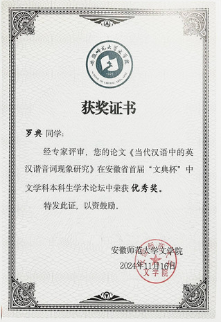 此次罗典同学获奖,不仅展现了个人学术能力,更体现了我院学术研究和人才培养工作实绩文传学院一直致力于为学生提供广阔发展平台,鼓励学生积极参与各类高水平赛事,以赛促学,以学促用,提升综合能力。