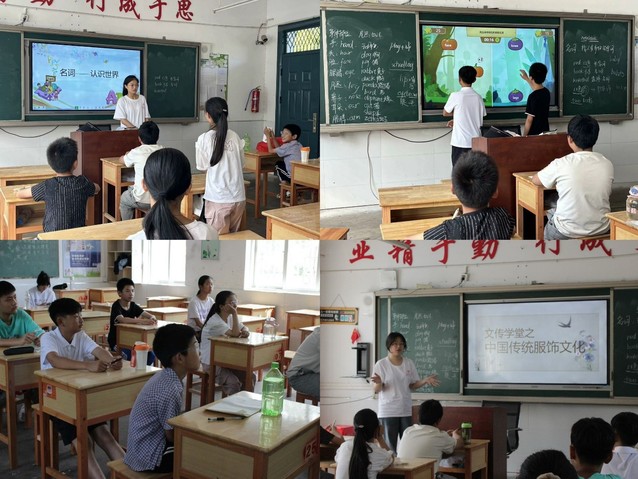 上午,初中组的教学活动既有教导孩子们知识的国学课和英语课,也有培养孩子们兴趣爱好的书画课和歌舞课。英语课上,教学组的老师以动画人物开头,衍生出各个英文单词,找到与孩子们的共同话题,引起孩子们参与课堂的积极性和活跃性,同时,通过双人词汇比赛的小游戏,增强了学生的求知欲,课堂氛围活跃,孩子们不仅收获了知识,更收获了学习的乐趣与欢笑。与此同时,中华传统文化服装是中华文明的象征和载体,因此,国学课的老师结合相关视频与课件对中国传统服饰服装进行介绍,从服装到头饰妆面,带领学生了解了从先秦到明清各个时期的传统服饰文化,增加了孩子们对中华博大精深的历史文化的了解与认识,也增强了他们对中华历史文化的探索欲。