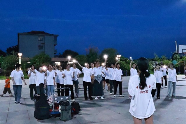 会议结束后,实践团队所有成员加入了文艺表演的大队伍,步行前往石板冲法治文化广场。在广场上,大家带领着镇民一起跳起了啦啦操,虽然动作简单,但带来的意义深刻非凡。此外,大家排练了合唱曲目《如愿》,夜幕降临,大家打开手机的手电筒,在空中随着歌曲的旋律摆动。整个广场上不仅充满着歌声,更洋溢着大家的欢声笑语,吸引了众多镇民前来参与,使全场氛围达到了顶峰。