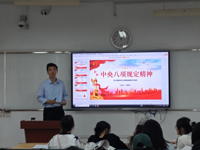 党课上,孙静宇结合典型案例,详细解读了中央八项规定的核心内容、重要意义及实践要求。他强调,全体党员要深刻领会中央八项规定精神的内涵,切实增强纪律意识,筑牢思想防线,将作风建设融入日常学习和工作中。同时,他要求学生党员以身作则,发挥先锋模范作用,带头践行勤俭节约、务实高效的作风,为营造风清气正的校园环境贡献力量。