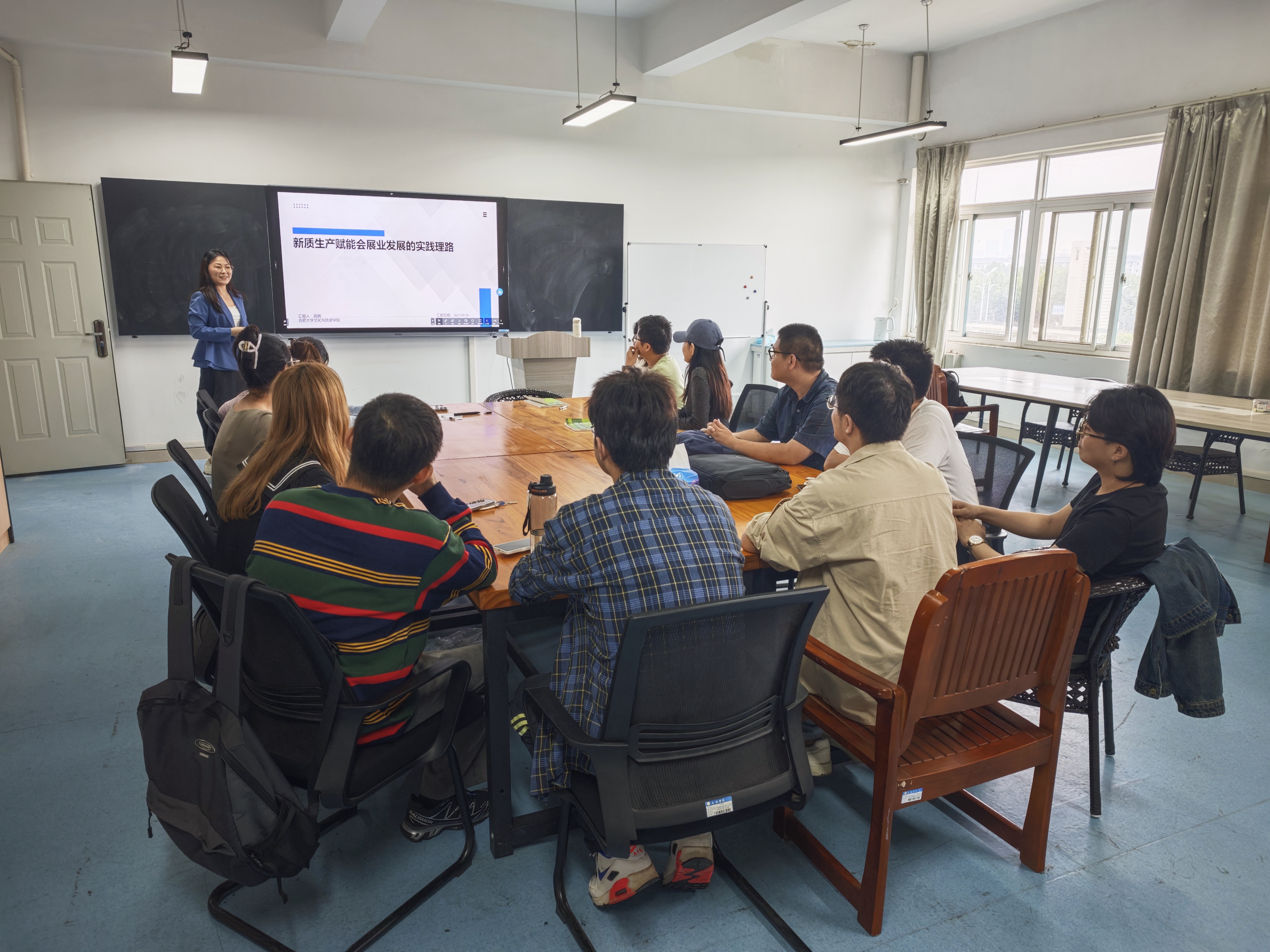 高老师为同学们讲述了新质生产力的概念、理论与相关研究情况,指出会展业作为平台经济的重要载体,天然需要新质生产力来重塑其价值链,实现从传统展示向创新驱动与效能提升的根本转变。讲座中重点以合肥市为案例,阐述了合肥市会展业的发展状况、新质生产力赋能会展业发展的实践路径,介绍了新能源汽车融合样板以及人才培养与政策展望。