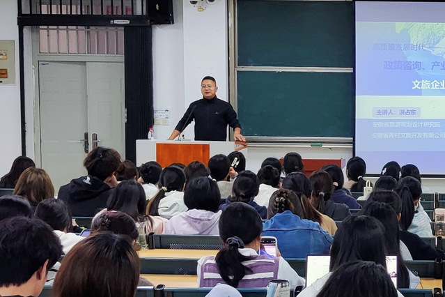 为进一步引导学生明确学习目标、把握行业趋势与岗位能力要求,1013日,文化与旅游学院邀请安徽省旅游规划设计研究院副院长(主持工作)、安徽省青村文旅开发有限公司总经理洪占东走进《专业导论》课堂,为25级与22级旅游管理专业学生作题为高质量发展时代的文旅企业发展路径的讲座。