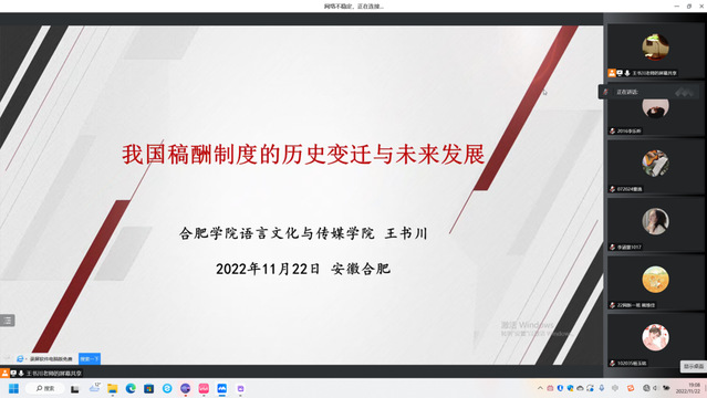 2022年11月22日晚7点,语言文化与传媒学院举办了一场主题为“我国稿酬制度的历史变迁与未来发展”的学术讲座。讲座在腾讯会议线上进行,由语言文化与传媒学院青年教师王书川主讲,22级新闻学、22级网络与新媒体两个专业共146名学生参加。