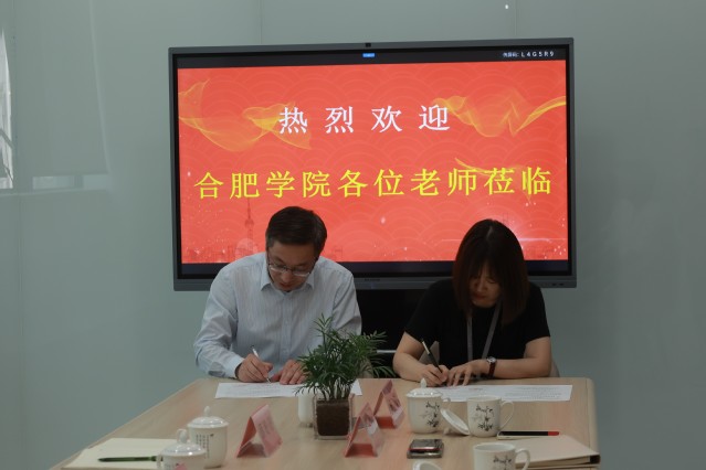 随后,学生处处长丁增云与公司副总经理王丽影共同为“大学生就业基地”揭牌。语言文化与传媒学院党委书记储昭辉代表我院与安徽半语品牌管理有限公司共同签订了“就业实习基地”协议。