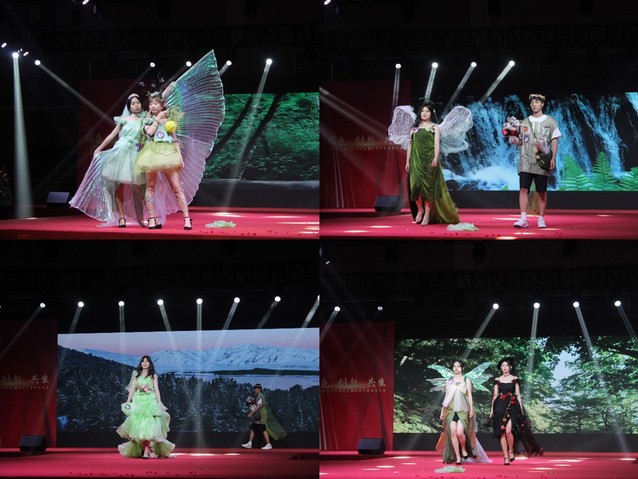 首先,由我校大学生艺术团为大家倾情演唱一首《放飞梦想》,此次比赛在优美的歌声中正式拉开序幕。各院模特队在本次比赛中以绿色环保为设计理念,运用身边日常用品作为服装设计材料,为大家带来了一场精彩的表演,各有特色,各有千秋。其中,语言文化与传媒学院模特队以《绿野仙踪,回归自然》为主题,利用垃圾袋、纱、布、树枝等来进行服装设计,充分彰显了环保的主题及时代特征。各位模特充满自信的表演充分展现了我院学生的青春风貌,体现了文化内涵和民族特色。在场观众掌声热烈,对于模特们的表演惊叹不止。最后,大学生艺术团又为大家带来了《如果是+致姗姗来迟的你》的歌曲表演,本次比赛正式落下帷幕,观众们回味无穷。