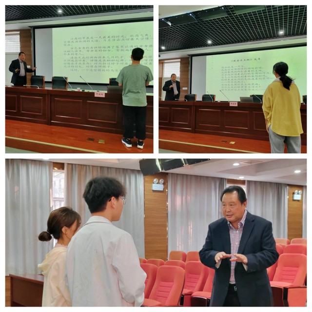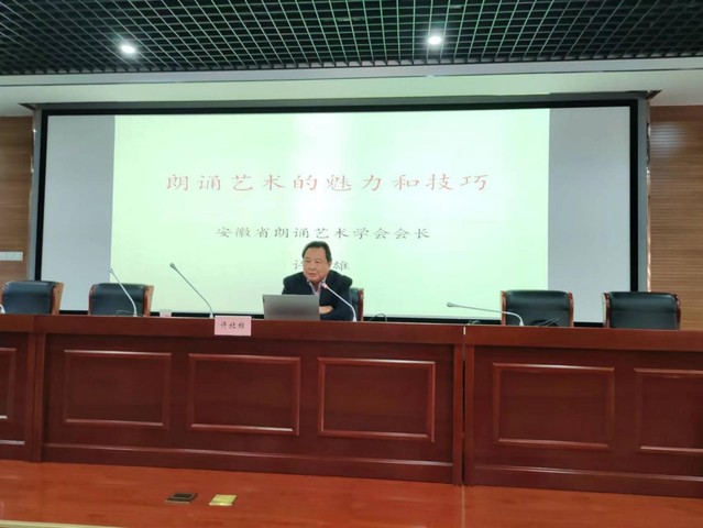 许北雄教授曾任安徽演艺集团艺术总监,安徽省徽京剧院院长,安徽省话剧团副团长,现为安徽朗诵艺术学会会长,是安徽省话剧表演、播音主持、朗诵艺术等领域领军人物和代表人物,曾获安徽省播音主持一等奖、安徽省艺术节表演一等奖等诸多奖项。讲座开始后,许教授从个人经历、作品展示、经验分享、朗诵技巧等方面向大家多角度、全方位地介绍了朗诵这门语言艺术,深入浅出地告诉同学们朗诵前应做何种准备工作、如何充分把握作品内容、怎样用声音充分演绎出作品的内涵以及怎样塑造鲜活的人物形象,并重点传授了朗诵的表现手段和基本方法,令人受益匪浅。