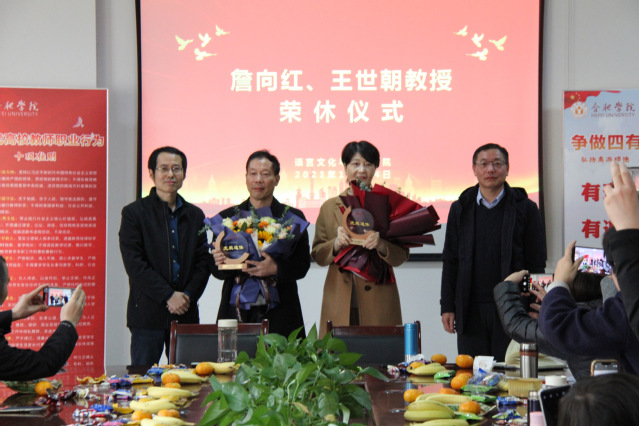 11月14日下午,语言文化与传媒学院在一期五栋二楼大会议室举行了2023年教职工荣休仪式,向2023年荣休的詹向红、王世朝两位教授表示感谢与祝福。学院领导班子成员、全体教职工参加仪式。