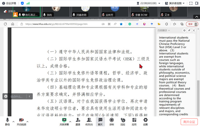 本次会议由五个环节组成:第一,互相介绍。导师和留学生彼此自我介绍,交换联络方式,增进组内成员熟悉度;第二,学习文件。导师组带领学生们认真学习了《合肥学院国际学生硕士学位授予工作实施暂行办法》《合肥学院硕士学位论文工作管理办法(修订)》《合肥学院硕士学位授予工作实施办法(修订)》等重要文件,强调遵守法律法规,以及校、院两级单位的相关规定;第三,近期要求。会议布置了近期工作,提醒组内学生需在规定时间内完成选课任务、尽快确定毕业论文选题方向;第四,规划进度。会议协商并确定了留学生在研期间的进度规划,包括毕业论文选题确定时间、开题报告提交时间、论文提交时间等,要求留学生按质按量按时完成任务;第五,确定例会时间。鉴于留学生学习、生活的特殊性,导师组和留学生共同协商,决定此后每月召开两次例会,听取留学生学习进度汇报,解决留学生当前学习困惑,给予留学生相关学习支持。