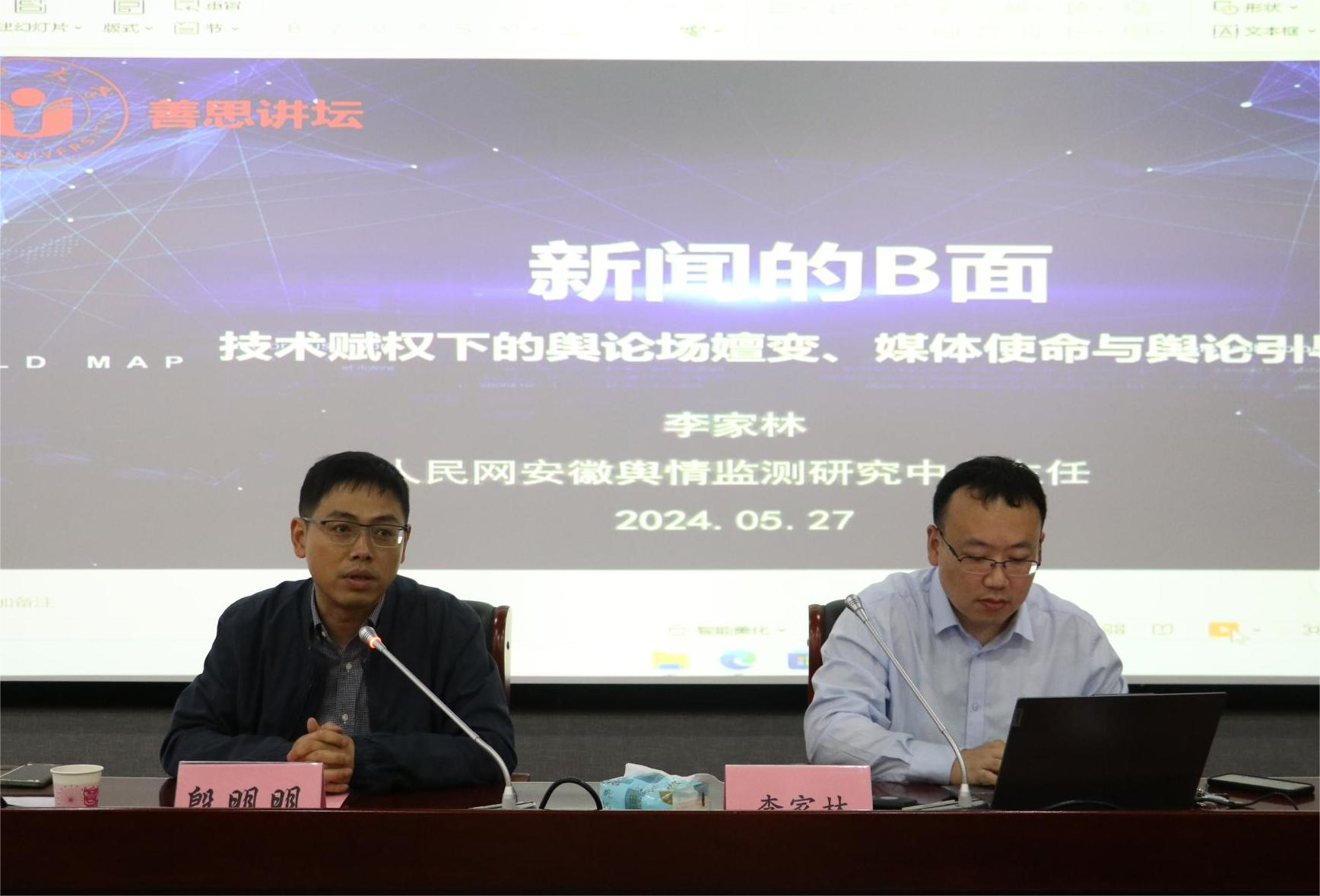 5月27日上午九点三十分,由语言文化与传媒学院主办的“善思讲坛”中青年学术讲座在一期六号楼报告厅顺利举行。本次讲座邀请了人民网安徽舆情监测研究中心主任李家林作题为“新闻的B面:技术赋权下的舆论场嬗变、媒体使命与舆论引导”的学术报告。讲座由语言文化与传媒学院副院长殷明明教授主持,学院80余位师生参加讲座。