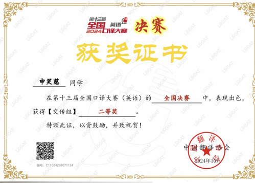 学习,是开启未知之门的万能钥匙,以智慧之光,驱散愚昧的阴霾,它是心灵的滋养剂,于知识沃野中,让思想的繁花绚烂盛放。申笑慈同学在校期间,不仅在学业方面大放异彩,而且在各类比赛上也是出类拔萃,她曾获得口译大赛全国二等奖、商务英语竞赛全国二等奖、“外研社·国才杯”英语演讲大赛全国铜奖、“外研社·国才杯”英语辩论赛”华东赛区三等奖、“讯飞杯”口语大赛全国亚军、第八届中西部翻译大赛全国一等奖、笔译全国二等奖、“21世纪杯全国演讲大赛”省级一等奖等诸多奖项。申笑慈始终坚信“天道酬勤,全力以赴”,在校期间她也曾获特等奖学金、国元证券奖学金、罗顿奖学金以及优秀团员、优秀班干、三好学生等荣誉称号。除此之外,申笑慈同学还积极参加各类社会实践活动,如中德商务交流会陪同口译、中德大学交流活动志愿者等,在实践活动中提升自己的综合素质,全方位综合发展。