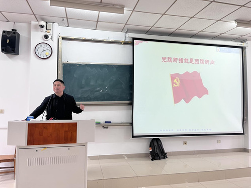 吴孔宝以“党旗所指就是团旗所向”为主题,聚焦党建带团建工作,围绕落实立德树人根本任务,从强化创新理论武装、严守意识形态红线、实现较高质量发展、夯实骨干队伍建设、选树学生模范典型、筑牢安全稳定底线六个方面展开授课,强调广大团员青年和学生干部要放眼世界、砥砺品行、追求卓越,要凝聚青春力量,引领校风学风。结合学院外语+专业建设特点,吴孔宝鼓励广大学子要努力提升自己的思想政治素养和外语听说能力,要积极参加各类竞赛,以赛促学。吴孔宝要求广大团学干部要积极作为,充分发挥团组织的引领力、服务力、组织力及大局贡献度,切实提升党建带团建工作质效。
