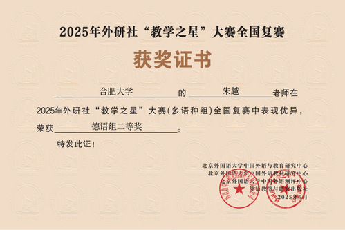近日,外国语学院德语系教师朱越在2025年外研社“教学之星”大赛德语组的复赛中脱颖而出,荣获全国二等奖。