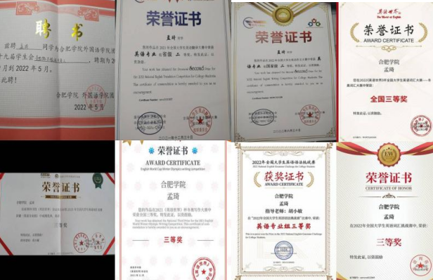 每一项成绩都是用时间与经历描绘出的画卷一笔一画点点滴滴每一步都尤为不易但是坚持才能创造奇迹拼搏就能书写未来莹莹星火光艳四射孟琦集点滴以汇江流用坚持不懈的努力和拼搏进取的精神树立了新的标杆国家励志奖学金、2021“批改网杯”全国大学生英语写作大赛优胜奖决赛全国一等奖、2022全国大学生英语作文大赛国家级二等奖等等都是孟琦在不断拼搏下取得的不菲成就值得敬佩与学习