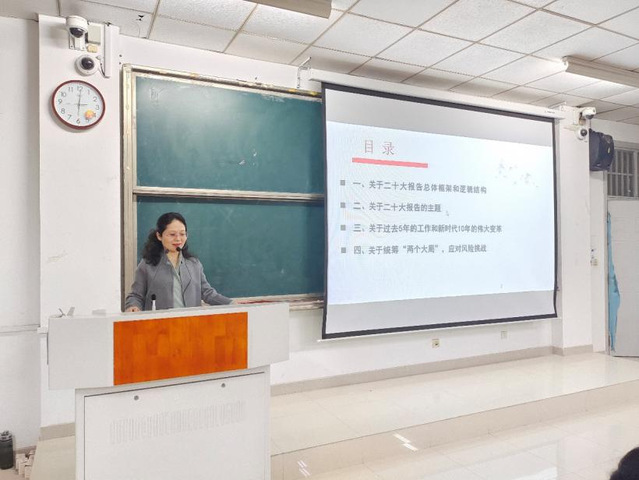 课程开始前,吴书记强调了学习党的二十大精神对于青年大学生的重要意义,在学员们热烈的掌声中,党课正式开始。苏教授从二十大报告的总体框架、逻辑结构和主题,五年的工作总结和十年的伟大变革,统筹“两个大局”并应对风险挑战等方面进行了讲解。谈到如何理解党的二十大精神,苏教授强调,我们要深刻领悟“两个确立”的决定性意义,牢记“三个务必”,始终坚持“五个必由之路”。作为青年一代,更要把实现中华民族伟大复兴的重任担在肩膀上,为全面建设社会主义现代化国家作出新的更大贡献。